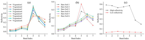 Spectral curves of endmembers. (a) Spectral curve of vegetation abundance; (b) Abundance spectral curve of bare soil; (c) High and low reflectance spectral curves.
