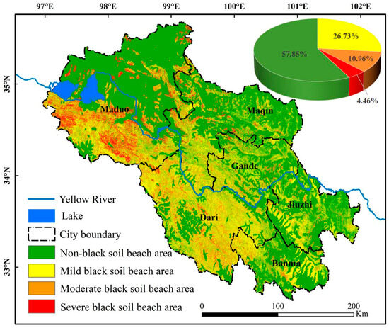In the process of extracting black soil beach, it is essential to take into account three distinct types of abundance in a comprehensive manner. Additionally, it is necessary to eliminate the impervious surface areas associated with both vegetation and bare soil. The classification of vegetation abundance is as follows: the vegetation abundance less than 20% or the bare soil abundance greater than 50% is divided into the identification area of severe black soil beach; the vegetation ranging from 20% to less than 40% is classified as a moderate black soil beach identification area; and the vegetation between 40% and less than 60% is designated as a mild black soil beach identification area [39]. Combined with the definition of black soil beach formation [8], the spatial distribution of black soil beach in Guoluo Prefecture was obtained by overlay analysis.