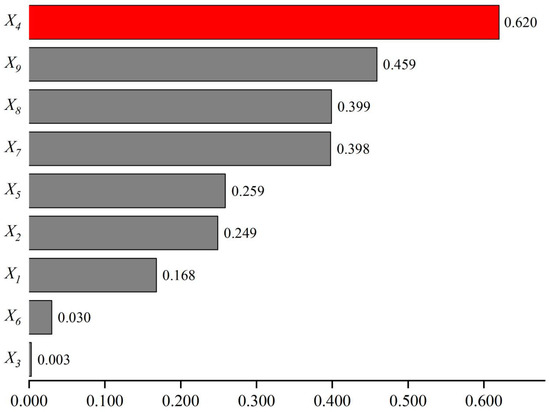 Detection q value of the driving factors of black soil beach distribution pattern. Note: The explanatory power of each factor in the figure is represented by a gray band, where the red band represents the highest explanatory power of the factor. X1: elevation; X2: slope; X3: aspect; X4: annual average precipitation; X5: annual average temperature; X6: clay content; X7: sand content; X8: silt content; X9: actual stocking capacity.
