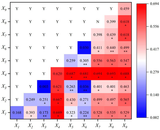 Driving factor interaction detection and ecological detection of black soil beach distribution pattern. * indicates two-factor enhancement, ** indicates nonlinear enhancement, Y indicates significant difference, and N indicates no significant difference. X1: elevation; X2: slope; X3: aspect; X4: annual average precipitation; X5: annual average temperature; X6: clay content; X7: sand content; X8: silt content; X9: actual stocking capacity.