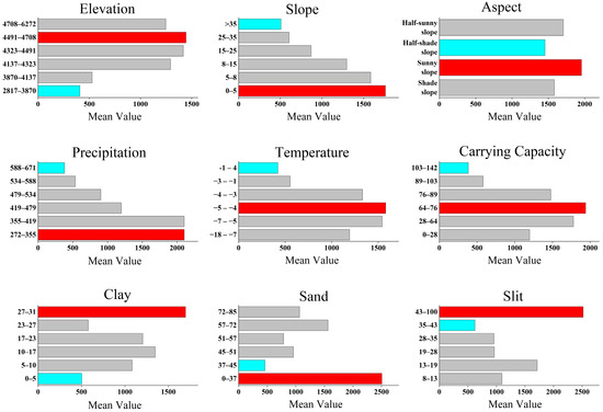 The findings from the geographical detector analysis (Figure 8) indicated a significant variation in the distribution of black soil beach across different classification intervals of the driving factors. Elevation and slope emerged as the primary topographic determinants influencing the distribution of black soil beach. Specifically, the most concentrated distribution occurred at elevations ranging from 4491 to 4708 m and slopes between 0 and 5 degrees, suggesting that vegetation degradation is particularly severe in high-elevation, low-slope areas, which is closely linked to the local natural environment and industrial activities. Regarding meteorological factors, the annual average precipitation of 272 to 355 mm and an annual average temperature between −5 and −4 °C were found to have the most significant impact on the rate of black soil beach formation. Furthermore, soil texture factors exhibited a pronounced effect on the distribution of black soil beach; the most concentrated distribution was observed when clay content ranged from 27 to 31%, sand content from 0 to 37%, and silt content from 43 to 100%, with an average area exceeding 2500 km2. Additionally, anthropogenic factors exacerbated the formation of black soil beach, with the fastest formation occurring at an actual stocking capacity of 64 to 76 MU/km2.