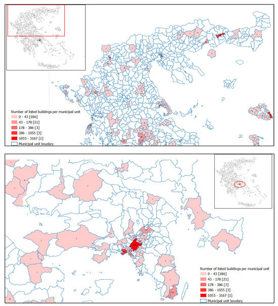 Number of listed buildings per municipal unit. Top: Northern and Central Greece: middle: Attiki Region; bottom: Southern Greece. The exact number of listed buildings is shown on each municipal unit’s centroid. Inside the brackets, the sum of municipal units falling into each of the five categories is shown.