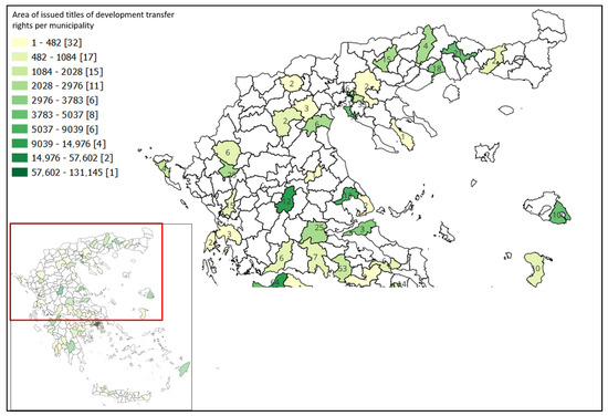 This similarly applies in the case of issued titles of development rights’ transfer. The majority of development rights’ transfer titles were issued in highly populated municipalities, with high urban concentrations and historic centres (e.g., the city of Athens and the Attika conurbation, Thessaloniki, Patra, Iraklion, Volos, Rhodes, Ioannina, Chania), and their neighbouring municipalities, in accordance with the legislation regulating the transfer of development rights at the time.