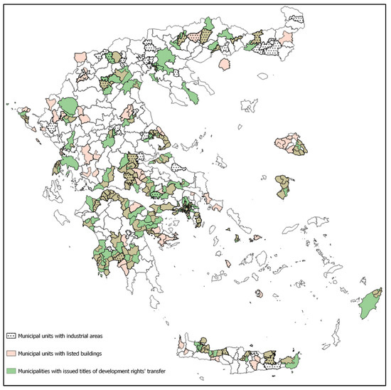 The transfer of development rights was established in Greece by the Law 880/1979 [24], aiming to introduce compensative measures for constitutional restrictions imposed on specific cases of real property objects. According to the Greek Constitution [25], “Monuments and historic areas and elements shall be under the protection of the State. A law shall provide for measures restrictive of private ownership deemed necessary for protection thereof, as well as for the manner and the kind of compensation payable to owners” (art. 24, par. 6). Within this context, Law 880/1979 allowed the transfer of development rights from a number of “encumbered” real property objects (e.g., listed buildings, land parcels on areas of special building conditions, and other types of Public Law Restrictions), to the same land parcel or to another land parcel. A Presidential Decree [26] specified the transformation of development rights from the “sending” parcel to the “receiving” parcel, while another Presidential Decree [27] was issued to regulate the administrative procedures of development rights’ transfer.
