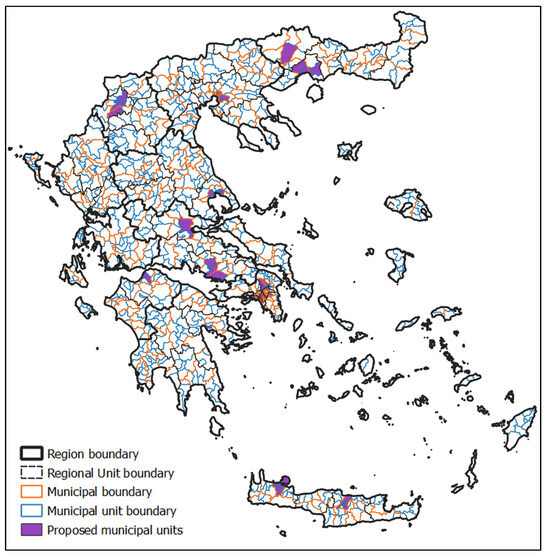 In order to investigate spatial relations as described earlier in the methodology description, the administrative division of Greece is used, available in vector format by the Hellenic Statistical Authority (ELSTAT) [47]. According to its administrative division, Greece is divided in 13 administrative Regions that pertain to 75 Regional Units. Regional Units comprise 326 municipalities, which are further divided into 1035 municipal units [48,49].