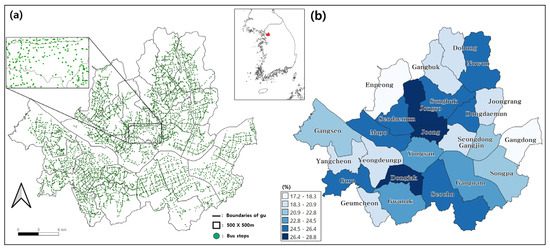 (a) Bus stop locations and (b) percentage decline in daily bus usage between 2019 and 2021: the red color indicates Seoul Republic of Korea (a).