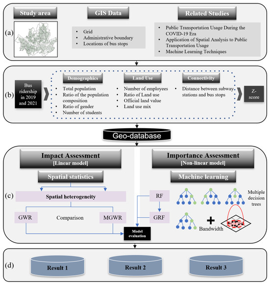 First, in the initial stage (Figure 2a), geographical information system (GIS) shapefiles based on a grid (500 m × 500 m) were employed to examine the spatial changes in public transportation volume in Seoul. A map was created to display the bus stops, with the daily average number of boarding and alighting passengers at each bus stop serving as the dependent variable. Relevant studies were reviewed to identify factors affecting changes in public transportation volume using a linear analysis.
