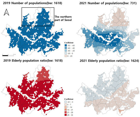 As shown in Figure 3, the total population variable exerted a negative influence on bus usage across most areas of Seoul in 2019. This may reflect a pre-pandemic urban environment where higher population areas, particularly in dense commercial or transit-rich zones, had more modal choices or greater reliance on subways or private transport. However, by 2021, this negative effect had diminished, particularly in central districts, and a positive relationship emerged in the northern parts of the city. This spatial shift suggests that population-driven demand for bus services increased in peripheral or residential areas during the pandemic recovery phase, potentially reflecting shifts in essential travel patterns, reduced subway usage due to infection concerns, or an increased reliance on local bus services in areas with limited alternative transit modes.