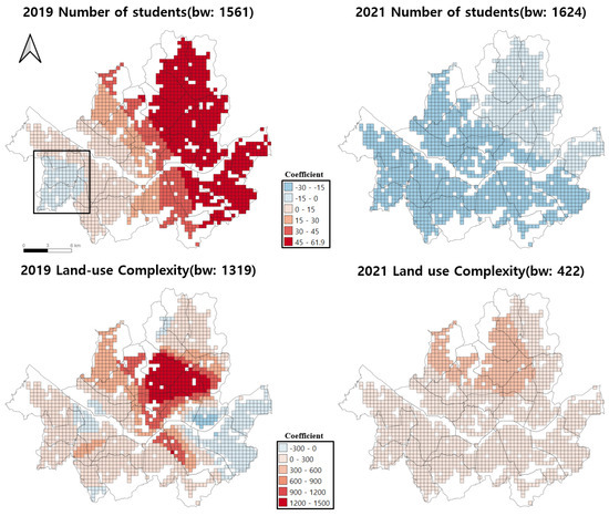 Multiscale geographically weighted regression coefficient maps: number of students and land-use complexity (the box in the upper-left map marks the Guro-gu–Yangcheon-gu boundary).