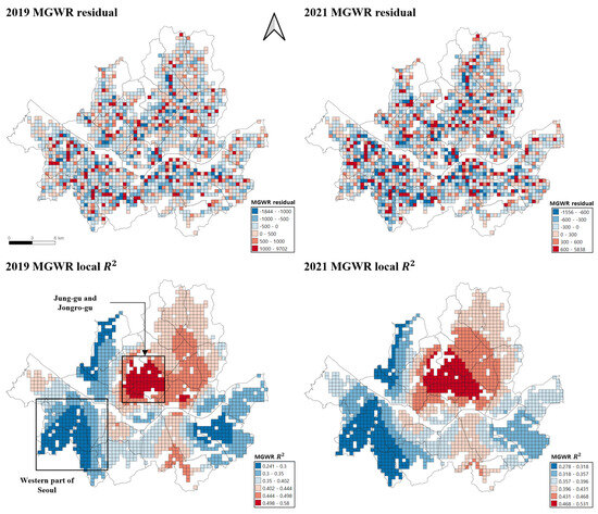 The number of students exhibited the most pronounced change among the variables, positively affecting bus usage in 2019 across most regions, excluding parts of Guro-gu and Yangcheon-gu. However, by 2021, the number of students became a negative determinant in all regions. The change was attributed to remote education in middle and high schools due to COVID-19. Land-use complexity also underwent notable change: in 2019, it exhibited positive and negative effects depending on the region, but by 2021, it had a uniformly evenly weak positive effect across all areas. This is due to the simplification of people’s movement factors as a result of social distancing. Figure 5 visualizes the residuals and R-squared values from the MGWR model.