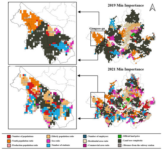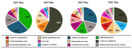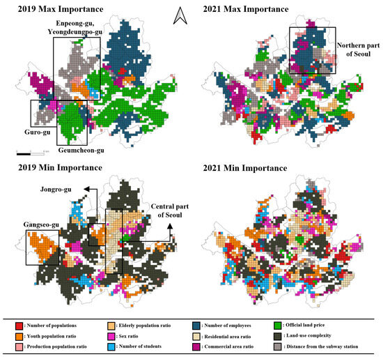 Several notable changes in variable importance were observed when comparing the results from the two periods. Similarly to the RF model, the importance rankings of variables, such as the official land price and number of employees, shifted. In 2021, the relative importance of variables, such as the commercial area ratio, distance from subway stations, and productive population ratio, significantly increased, with changes exceeding 10. The over-65 population ratio (ranked 11th in 2019) advanced to sixth place in 2021, indicating the most substantial change. Figure 6 presents a variable importance map from the GRF model, highlighting the highest and lowest importance values across the grids. In addition, Figure 7 depicts the area ratios of variables with the maximum and minimum importance values.