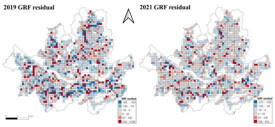 Figure 8 presents the residual map for both 2019 and 2021. The map indicates that the residuals are largely randomly distributed across the study area, with no clear spatial patterns emerging in either period. Moran’s I values for the GRF model residuals were 0.069 for 2019 and −0.005 for 2021. These values suggest a lack of significant spatial dependence, implying that the model adequately captured the major spatial patterns in bus ridership and that there were no residual spatial effects that could be explained by other factors.