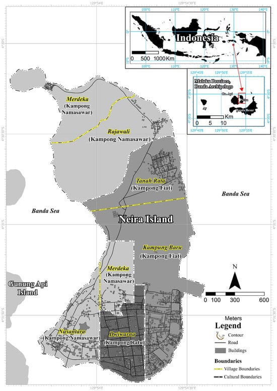 The research took place in Banda Neira, an island within the Maluku archipelago that holds profound cultural, social, political, and religious significance. Administratively, Banda Neira is divided into several villages (Figure 1), which are organized under three main customary (adat) villages: