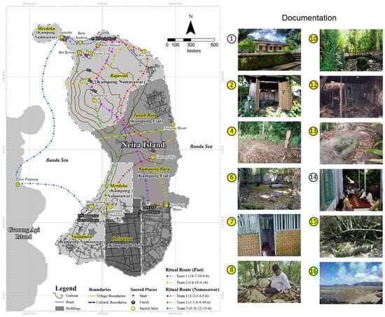 This study focuses on the sacred sites in Kampung Adat Namasawar and Fiat (Figure 2), which have been shaped by generations of ritual practices, ancestral beliefs, and the Banda indigenous community’s history. Namasawar, founded during the era of the Lautaka kingdom, is closely tied to the narrative of resistance and sacred natural sites, particularly before the 16th-century VOC massacre [8]. In contrast, Fiat developed and was formed after the massacre and was more integrated with the spread of Islam and religious authority, emphasizing spiritual continuity than historical resistance [40]. Ratu Village (Dwiwarna), in comparison, is excluded from this study due to its colonial roots and lack of ritual continuity. The historical context of each village shapes its representation of space, where colonial power intervenes and defines the spatial layout of the village, but indigenous people continue to produce sacred spaces through narratives of resistance and spiritual customs with varying intensity between Namasawar and Fiat. This historical foundation informs the different relations between humans, space, and spiritual power, while serving as the framework for understanding the production of sacred space in Banda.