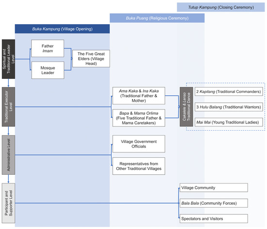 The hierarchical organization structure of the Buka Kampung ritual in Banda Islands, illustrates the various levels of authority and participation from spiritual leaders to community members, including traditional roles, administrative positions, and participant categories.