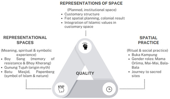 Women in Banda have played a central role in safeguarding land, customs, and lineage in the Banda Islands since the colonial period in 1609 [47]. This is reinforced by the presence of the Bhoy Kherang and Siti Galsoem figures in the oral history of Banda, showing how women are the main actors in maintaining customary space and spirituality [46]. In the customary structure, the Mama Lima and Mama Sembilan groups hold authority in carrying out rituals, from preparing offerings to spiritual purification. Women also play a role in transmitting customary values to the younger generation, as well as leading aspects of rituals that touch on everyday dimensions, such as processing nutmeg and arranging traditional houses. Mai-Mai’s involvement in the Lenso dance during the liminal phase of the ritual reflects the importance of women’s representation in sacred transitions and cultural regeneration. According to Lefebvre, representational spaces are strongly influenced by affective and symbolic experiences, which in the Bandanese context are actively managed by women. This proves that the production of space is not only the result of male authority, but also comes from women’s deeply rooted spiritual and social experiences. In rites of passage, women play a role in the stages of transition and social recovery, making them guardians of social cohesion and customary values. So, academically, the role of women in the production of sacred Bandanese spaces is not complementary, but rather a core element in customary regeneration and continuity.