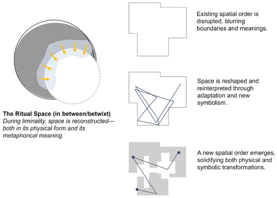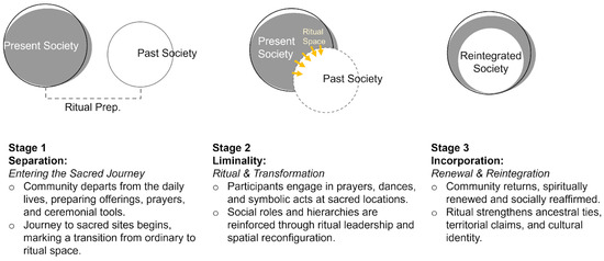 Arnold van Gennep’s theory of rite de passage (1909) provides a structured understanding of life transitions through three phases: separation, liminality, and incorporation [17]. The first phase, separation, involves the individual’s departure from their previous social role and identity. During liminality, individuals find themselves in a state of ambiguity, existing between their former and new roles, where they are socially and symbolically dislocated. This phase is often characterized by rituals that facilitate transformation and reflection. Finally, the incorporation phase marks the reintegration of the individual into society, often with a new social identity or role. These phases are universal in marking significant changes in social roles, from birth to death, often through symbolic rituals that guide individuals through each stage. The significance of these rituals is not only in the individual transformation but also in the way society’s structure maintains cohesion through these processes [16,35,36,37]. During such transformation, individuals or groups are in a state of ambiguity or ‘liminality’ between previous and new social roles [27]. In ritualistic contexts, liminality serves as a space where individuals can transform, gaining new status or clarity upon their reintegration into society [38]. Santos-Granero (1998) suggests that liminality is not confined to individual experiences but can also be observed in collective rituals where communities use this transitional space to renegotiate their cultural identities within historic landscapes [39].