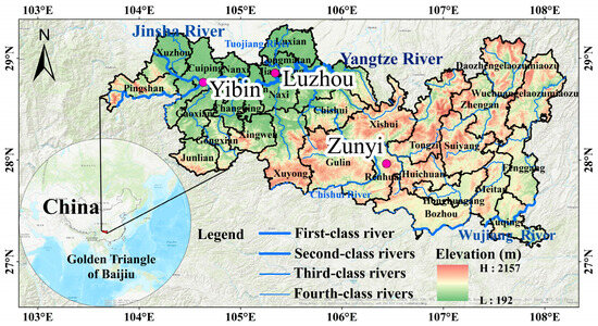 The BGT is located in Southwest China and primarily consists of three major cities: Yibin, Luzhou, and Zunyi. The geographic coordinates of this region range from 105°10′ E to 108°00′ E longitude and 27°00′ N to 29°30′ N latitude, covering a total area of approximately 68,000 km2. The region is characterized by complex topography, with higher elevations in the northwest gradually decreasing towards the southeast. The landforms within BGT include mountains, hills, and plains (Figure 1). The BGT region falls within the subtropical monsoon climate zone, featuring a mild and humid climate. The annual average temperature ranges between 16 °C and 19 °C, while annual precipitation varies between 800 mm and 1200 mm. The region boasts diverse vegetation types, including evergreen broadleaf forests, deciduous broadleaf forests, and coniferous forests, with natural vegetation exhibiting a distinct vertical zonation pattern. The BGT region has a well-developed hydrological network, with the Yangtze River and its tributaries flowing across the area, providing abundant water resources. Yibin and Luzhou are situated along the Yangtze River, while Zunyi is covered by the Chishui River Basin. These rivers play a crucial role in supporting local agriculture and the Baijiu brewing industry. Moreover, the region is characterized by fertile soils, primarily red soil, yellow soil, and purple soil, which are highly favorable for agriculture, particularly the cultivation of high-quality raw materials essential for Baijiu production.