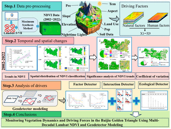 The technical workflow of this study is depicted in Figure 2 and comprises the following steps: 1. Data acquisition and preprocessing: Satellite imagery from Landsat 5, 7, and 8, spanning 2002 to 2022, was acquired and subjected to essential preprocessing steps, including atmospheric correction and georeferencing. The maximum value composite method, alongside additional preprocessing techniques, was applied to derive a clear NDVI from multi-temporal images. This approach minimized cloud cover interference and enhanced data quality. 2. Spatiotemporal change analysis: NDVI data were analyzed spatiotemporally to evaluate trends in vegetation cover changes within the BGT region. The Theil–Sen median trend analysis was employed to quantify NDVI change trends, while the Mann–Kendall (MK) test assessed the statistical significance of these trends. Additionally, the coefficient of variation (CV) was used to characterize the spatiotemporal variability in the NDVI, providing insights into the stability and heterogeneity of vegetation cover. 3. Selection of driving factors: drawing on prior research, nine representative variables were selected as driving factors to investigate their influence on vegetation changes. 4. Analysis of driving factors: The GD model was utilized to dissect the roles of these driving factors. Specifically, the factor detector quantified the individual contribution of each factor to vegetation changes. The interaction detector evaluated pairwise interactions between factors. The ecological detector elucidated the combined ecological impacts of these factors. 5. Quantitative analysis and summary of driving factors: The results from the above analyses were statistically evaluated to quantify the influence of each driving factor on vegetation changes across varying temporal and spatial scales. This enabled the identification and summarization of the primary drivers of vegetation change in the BGT region.