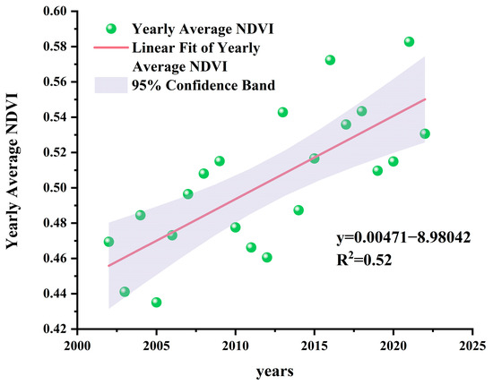 To comprehensively analyze and understand the spatiotemporal variation characteristics of the NDVI in the BGT region, this study draws upon existing literature and employs the equal interval method in ArcGIS to classify the NDVI into four distinct levels [52,55]: low coverage (<0.2), medium–low coverage (0.2–0.4), medium–high coverage (0.4–0.6), and high coverage (≥0.6) (Table 4). The results reveal that, over the period from 2002 to 2022, the NDVI in the BGT region exhibited a phased, fluctuating upward trend. Over these 20 years, the mean NDVI increased by 9.80%, corresponding to an average annual growth rate of 0.49%, indicative of a sustained improvement in vegetation coverage within the study area.