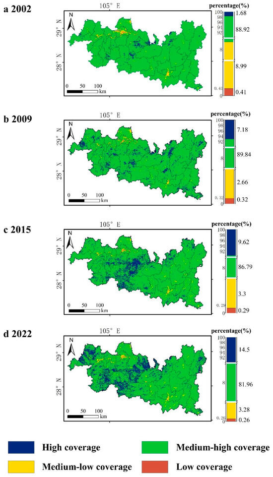 From 2002 to 2022, the extent of high vegetation cover expanded significantly, particularly in the Yibin and Luzhou regions of Sichuan Province. Notable examples include Xuzhou District, Changning County, Xingwen County, Pingshan County, and Gong County of Yibin, as well as Hejiang County and Xuyong County of Luzhou, all of which demonstrated marked increases in vegetation cover. Similar growth trends were observed in Chishui City and Wuchuan Gelao and Miao Autonomous County in Zunyi. Concurrently, areas with low and medium–low vegetation cover diminished, especially in Luzhou, where spatial contraction indicates improved vegetation conditions in peri-urban zones. Overall, the expansion of high vegetation cover is predominantly concentrated in Sichuan Province, underscoring a regional enhancement in vegetation cover.