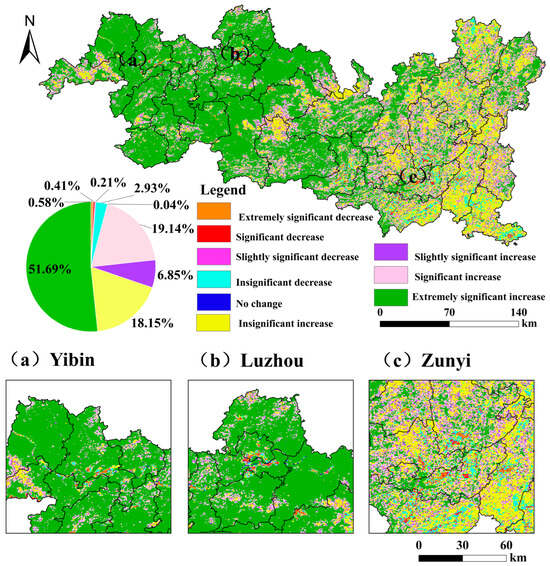 Utilizing the Sen + MK trend analysis method, we generated a significance map of the annual mean NDVI change trends in the BGT from 2002 to 2022 (Figure 6). The analysis reveals that vegetation in the majority of the BGT exhibits an improving trend, with the magnitude of increase far surpassing that of decrease. According to the trend analysis (Table 5), the most pronounced improvement is a highly significant increase, accounting for 51.68% of the area, primarily concentrated in Sichuan Province. In Guizhou Province, this trend is more dispersed, mainly observed in Wuchuan Gelao and Miao Autonomous County, the northern and central parts of Tongzi County, and regions bordering Sichuan Province. Areas showing non-significant, marginally significant, and significant increases in vegetation cover account for 19.14%, 6.85%, and 18.15%, respectively. Vegetation cover degradation, by contrast, is minimal, comprising only 4.17% of the total area, and is predominantly localized around the urban centers of Yibin, Luzhou, and Zunyi, with degradation patterns radiating outward from these cities.