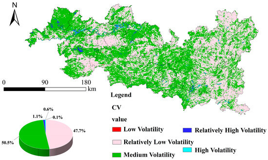 In this study, the CV of the NDVI in the BGT region from 2002 to 2022 was calculated (Figure 7), revealing the fluctuation characteristics of vegetation cover in this area. For further quantitative analysis, based on established classification principles [56,57,58], the CV was categorized into five levels: high volatility (≥0.20), relatively high volatility (0.15–0.20), medium volatility (0.10–0.15), relatively low volatility (0.05–0.10), and low volatility (0–0.05). Nearly half of the BGT region exhibits medium volatility, while 47.81% of the area shows low to relatively low volatility in vegetation cover, indicating overall high stability of the NDVI in the study area from 2002 to 2022.
