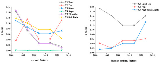 Regarding human activity factors, the influence of land use type (X7) on vegetation NDVI in BGT displayed variability over the study period. Its q-value decreased from 0.1928 in 2002 to 0.1202 before rebounding to 0.1610 by 2022, reflecting an unstable impact on vegetation dynamics. The q-value for population density (X8) rose consistently from 0.0414 to 0.0616, indicating a strengthening influence on vegetation changes, particularly amid accelerating urbanization in BGT. Most notably, the q-value for night-time light (X9) surged from 0.0145 to 0.1333, with a marked increase between 2017 and 2022. This pronounced rise highlights a substantial escalation in its impact on vegetation, reflecting the intensifying pressures of urbanization and human activities in BGT. Collectively, these findings demonstrate that human activity factors, especially night-time light, have progressively emerged as critical drivers of vegetation changes in the region.