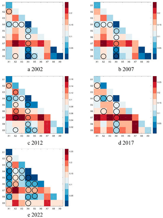 Ecological detection revealed marked differences in factor interactions over the 20-year study period. In 2002, significant interactions were observed between the annual mean temperature (X1) and both annual precipitation (X2) and night-time light (X9), whereas the association between slope (X3) and soil data (X6) remained weak. Over time, the complexity of factor interactions increased: the relationships between annual mean temperature (X1) and aspect (X4), as well as night-time light (X9), strengthened, and land use (X7) consistently exhibited strong associations with other factors across both periods. By 2022, interactions involving population density (X8) displayed a more differentiated pattern, underscoring the increase in the impact of human activities on vegetation ecology.