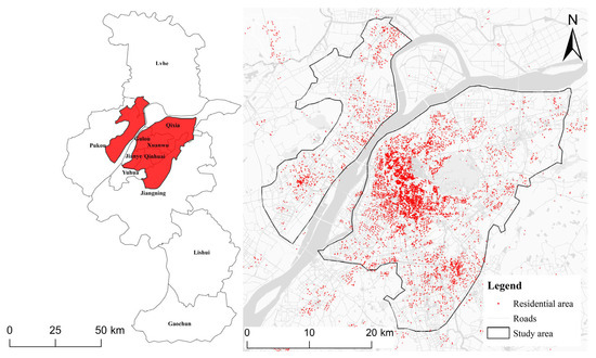 Nanjing is the capital of Jiangsu Province and one of the core cities of the Yangtze River Delta urban agglomeration, with a permanent population of 9.4911 million and an urbanisation rate of 87.01% by the end of 2022. Its urban development model, spatial organisation, and housing price trends are highly representative of China’s megacities. In this paper, the central urban area of Nanjing delineated in the Nanjing Territorial Spatial Planning (2019–2035) is selected as the study area (Figure 1), and 6268 residential communities within the area are taken as the study objects to investigate the influencing factors of housing prices in megacities.