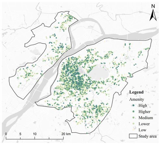 - Social atmosphere amenity represents the psychological comfort derived from the social and cultural atmosphere of the city, which includes aspects such as social inclusivity and cultural diversity. As the amenity of the social environment is difficult to measure directly, this study uses the presence of universities and research institutions—representing areas with a strong atmosphere of diversity and inclusiveness—as a proxy to reflect the cultural environment of different urban areas [22], thereby assessing social atmosphere amenity.
