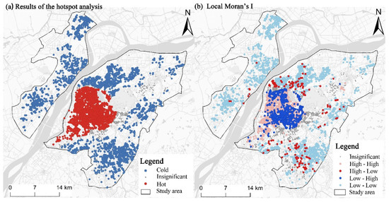 Spatial differentiation of housing prices in the central urban area of Nanjing: (a) results of the hotspot analysis; (b) Local Moran’s I.
