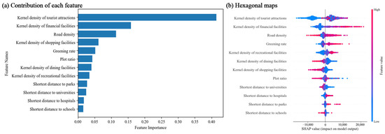 This study conducted a regression analysis of housing prices in Nanjing using the GBDT algorithm (Figure 4). This study applies 5-fold cross-validation to systematically optimise the hyperparameters of the GBDT model. To balance model performance and computational efficiency while reducing the risk of overfitting, the model is configured with 100 decision trees, a learning rate of 0.1, and a maximum tree depth of 5. The resulting R2 score of 0.60 indicates that the model exhibits satisfactory predictive performance. The results suggest that among the 12 influencing factors of urban amenity, the most prominent effects on housing prices are found to be the kernel density of tourist attractions, kernel density of financial facilities, and density of road networks. Additionally, the kernel density of dining facilities, the kernel density of shopping facilities, the green space rate and the plot ratio of the community were found to have relatively remarkable impacts on housing prices. However, contrary to the existing research outcomes [24,25], this study found that the shortest distance from the community to primary and secondary schools has a weaker influence on housing prices.