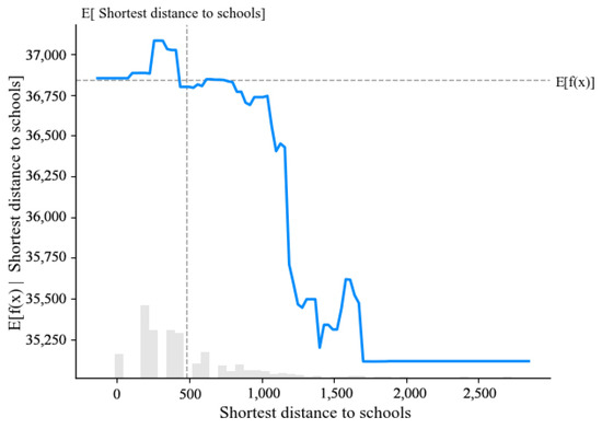 To further investigate the impact of schools (i.e., educational resources) on housing prices, this study examined the nonlinear relationship between the distance from a community to schools and housing prices (Figure 5). When the minimum distance between a community and primary/secondary schools is less than 1500 m, housing prices exhibit a pronounced upward trend as the distance diminishes; however, when the minimum distance is greater than 1700 m, this factor no longer has a meaningful impact on housing prices. This result demonstrates that residents’ preference for housing in school districts is primarily due to the fact that they provide their children with more accessible conditions for commuting to and from school. However, when the shortest distance from the housing to the school is greater than 10 min by walking (i.e., 1500 m), the accessibility provided by housing becomes relatively insubstantial; thus, the distance factor to the school no longer contributes significantly to housing prices.
