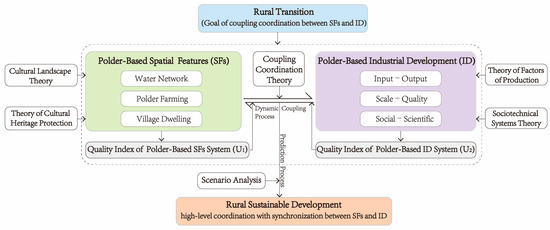 The coupling relationship between polder-based SFs and ID is a complex system involving culture, landscape, ecology, economy, and society [44]. This study focuses on polder regions, unique agricultural areas formed through land reclamation. The conceptual framework in Figure 1 illustrates the composition and interactions of these subsystems.