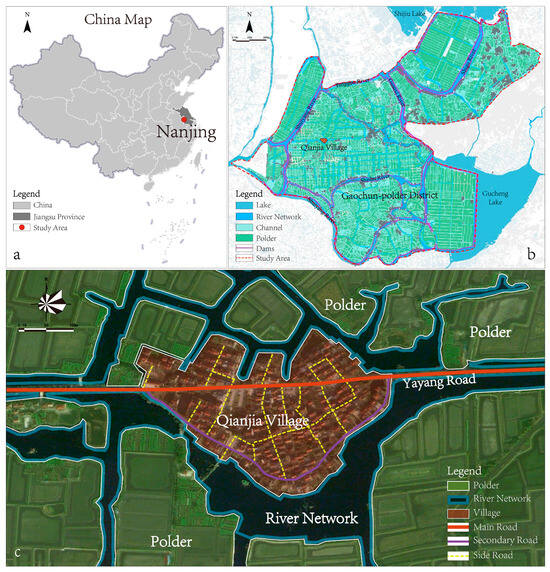 Study area: (a) the location of the study area in China; (b) the boundary of the Gaochun Polder District and the location of Qianjia Village in the Gaochun Polder District; (c) spatial patterns and spatial elements in Qianjia Village. Source: self-drawn by the author. (a,c) Adapted from remote sensing satellite maps, (b) drawn by overlaying government data and map crawling.