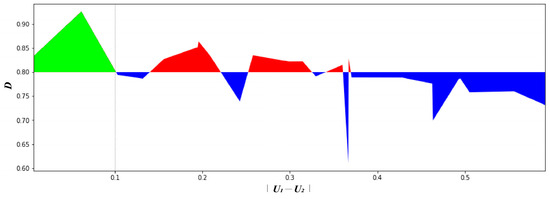 The distribution of the 25 regulation scenario types is shown in Figure 3. The vertical axis represents the CCD, while the horizontal axis shows the absolute difference between the quality indices of the two systems. Additionally, the classification of the scenarios was determined by the horizontal line , which divides basic coordination () from high-level coordination (). The vertical line, , marks the boundary between synchronized and unsynchronized scenarios. The 25 scenarios were classified into three categories: the green area represents high-level coordination and synchronization between the two systems, the red area shows high-level coordination with ID lagging behind SFs, and the blue area represents basic coordination with ID lagging behind SFs. Most scenarios were found in the blue area, which corresponds to the current situation. Only three scenarios (scenarios 5, 14, and 22) were in the green area, representing the target type of high-level coordination with synchronization between and (addressing Research Question 3/Objective 3).