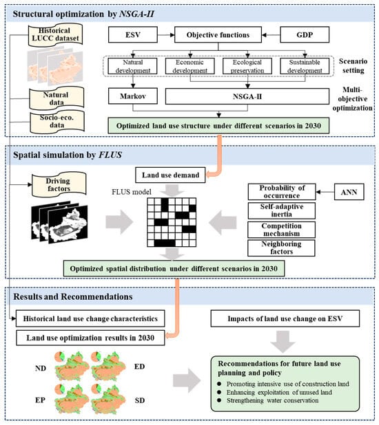 To address the above conflict, this study focuses on multi-objective land use optimization in Xinjiang, targeting the dual goals of maximizing ecosystem services and economic benefits. An integrated multi-objective optimization framework, namely NSGA-II-FLUS, is developed (Figure 1). Firstly, the structural optimization of land use is performed based on the non-dominated sorting genetic algorithm II (NSGA-II). This process includes establishing optimization functions, setting constraints, and then predicting the optimal land use structure in 2030 under four predefined development scenarios, i.e., natural development (ND, i.e., the future land use change will follow the historical trend without external intervention or regulatory measure), economic development (ED), ecological preservation (EP), and sustainable development (SD). Secondly, the spatial simulation of the optimized land use structure is conducted using the FLUS model. Finally, land use change characteristics, land use optimization results—in terms of both quantity and spatial distribution—and the impacts of land use change on ESV are obtained and analyzed, providing a foundation for future land use planning.