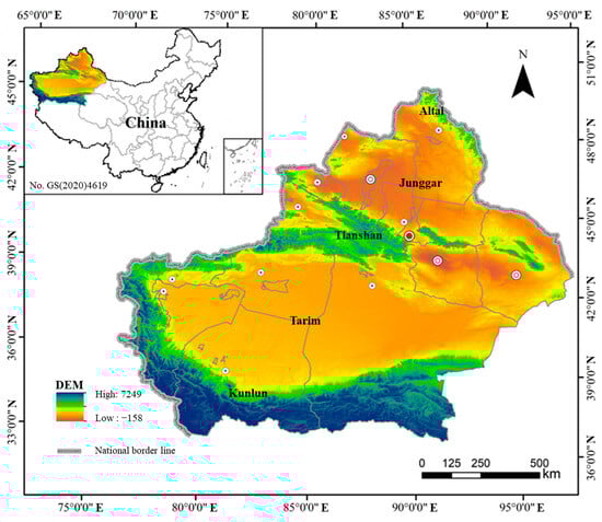 Xinjiang (73°33′–96°42′ E, 34°25′–49°17′ N) is the largest provincial-level administrative unit in China (Figure 2), situated in the northwest. It covers an area of 1.66 × 106 km2, which is approximately one-sixth of China’s total land area. Xinjiang’s topography is made up of alternating high mountains and basins, creating a distinctive feature of “three mountains surrounding two basins”. The three mountains are the Altai Mountains in the north, the Tianshan Mountains in the middle, and the Kunlun Mountains in the south. Between the three mountains are the Tarim Basin and the Junggar Basin. Due to its mountainous surroundings and distant distance from oceans, Xinjiang presents a temperate continental arid climate. This makes Xinjiang the largest arid region in China, accounting for over 60% of the total arid area. The average annual precipitation ranges from 100 to 230 mm, whereas the average annual evaporation ranges from 2000 to 3000 mm.