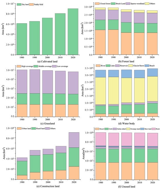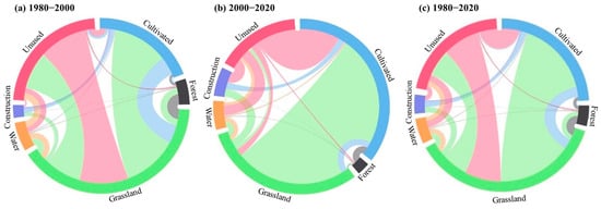 Figure 3 presents the area changes of the six primary land use types from 1980 to 2020. Further, they are subdivided into 24 subtypes to illustrate their internal structures. During the research period, unused land was consistently the most dominant type, accounting for around 60%, followed by grassland at around 30% and cultivated land at around 6%. In contrast, the scales of water bodies, forest land, and construction land were quite small (less than 3%). Cultivated land, mostly in the form of dryland due to its arid climate, exhibited a considerable expansion of 47.18%. Forest land encountered the most degradation, a drop of 5.84%, primarily due to the loss of closed forests and brushland. Low, medium, and high-coverage grasslands all suffered various degrees of degradation, resulting in an overall drop of 4.15% in the total grassland area. The degradation of forest land and grassland was partly due to arid climate and poor soil and partly due to excessive human reclamation. The permanent glacier and snow, constituting about 50% of the water body, experienced a reduction of 8.45% as a result of global climate change. However, there was a 3.04% increase in the overall area of the water body due to the enlargement of rivers, lakes, reservoirs, ponds, and beaches. The construction land was a carrier of high-intensity human activities, and thus, its expansion scale was the most remarkable, with an increase of 115.66%. Furthermore, there was a noticeable reorganization within construction land; that was, the proportion of land devoted to transportation, industrial, and urban construction grew substantially relative to that of rural residential land. Unused land accounted for more than 60% of Xinjiang’s total area, which remained steady during the research period (−1.21%). This was due to the fact that the majority of unused land consisted of the desert, Gobi, saline–alkali land, swampy land, and bare land, which significantly heightened the challenges of development and exploitation. In summary, the predominant pattern in land use transition during the research period was the increase in construction land (+115.66%) and cultivated land (+47.18%) at the expense of grassland (−5.48%) and forest land (−4.15%), both of which hold substantial ecological significance.