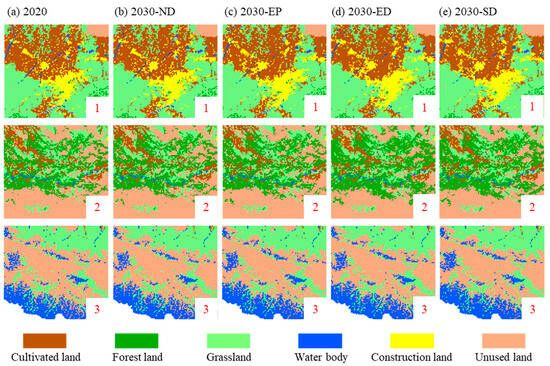 The optimized land use structures in 2030 under different scenarios, along with the driving factor data, were input into the FLUS model according to the flowchart in Figure 1. Then, the spatial simulation outcomes for 2030 corresponding to each scenario were generated, as displayed in Figure 5. Across all these scenarios, the land use distribution characteristics remain basically consistent. In particular, they are highly correlated with the unique topography of Xinjiang, i.e., “three mountains surrounding two basins”. Forest land and grassland are predominant in the mountainous regions and the adjacent basin regions. Oases are primarily located in some narrow zones between mountains and basins, where cultivated land and construction land are predominant. These regions have relatively better soil and irrigation conditions. Water bodies are scattered across valleys and high-altitude areas. Furthermore, unused land, primarily in the form of desert and Gobi, occupies the majority of the two basins.