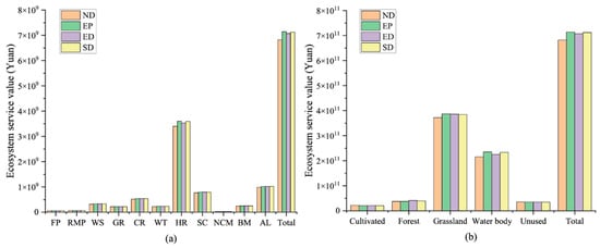The results of the predicted ESV in Table 3 are further analyzed to illustrate the impacts of land use change on ESV, as presented in Figure 7. The ranking of the ESV among these development scenarios is as follows: EP > SD > ED > ND. The fact that the ND scenario comes in last indicates that neither economic nor ecological benefits could attain their full potential in the absence of external intervention or regulatory measures. For individual ecosystem service functions (Figure 7a), hydrological regulation, aesthetic landscape, and soil conservation services are the three most significant contributors to the total ESV. In particular, the hydrological regulation service accounts for around 50%, owing to the high ecological significance of the water body (see Table 2). As a consequence, the total ESV exhibits a high correlation with the value of the hydrological regulation service. This highlights the significance of water resources for Xinjiang. The contributions of different land use types to the total ESV are in the following order: grassland > water body > forest land > unused land > cultivated land (Figure 7b). Grassland contributes the most, representing around 50% of the total. This is mainly due to the widespread distribution of grassland, as well as its important role in hydrological regulation and soil conservation services (Table 2). Water body ranks second despite being the fourth largest in terms of area, accounting for around 30%. This explains why the EP scenario has the highest ESV since its grassland and water body areas are obviously larger than the other scenarios. Furthermore, the overall contribution of cultivated land, forest land, and unused land to the total ESV is below 20%, although they make up about 70% of Xinjiang’s total area. In all, grassland and water bodies play a crucial role in Xinjiang’s ecological benefits and should be prioritized in land use planning.