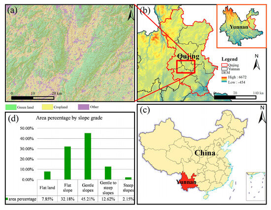 Geographic location of the study area. (a) Topography and land use types in the study area. (b) Location of the study area in Qujing City, Yunnan Province. (c) Location of Yunnan Province in China. (d) Slope grading statistics of the study area.