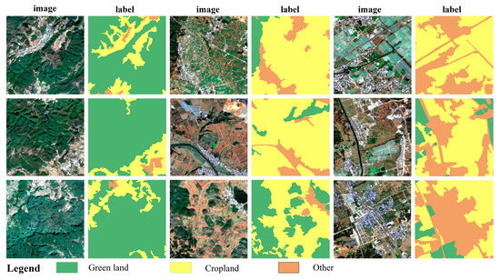 Ground truth data were primarily obtained by manually vectorizing the entire study area based on high-resolution imagery from Google Earth (https://earth.google.com/web/, accessed on 6 March 2024). Since the focus of this study was on cropland, the land cover types were categorized into cropland, green land (forests, grasslands, and shrublands), and other (urban land, water bodies, bare land, etc.) for simplicity. The ground truth data collection method is as follows: first, high-resolution remote sensing images from Google Earth in 2022 were selected and cropped to match the study area. The land cover types within the study area were visually interpreted and vectorized into three categories. To ensure the accuracy and reliability of the annotations, the labeling process involved multiple annotators who independently labeled the same areas, and their results were cross-validated to resolve any inconsistencies. Next, the vectorized results were converted into raster data with a resolution of 10 m and saved as TIF files to obtain the ground truth data. Finally, the ground truth data were cropped into 256 × 256-pixel tiles with a 128-pixel stride, generating the labeled image set required for the deep learning network, totaling 5376 images. Figure 2 shows an example of the data.