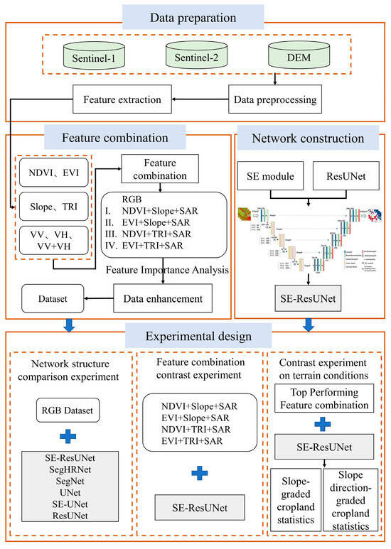The research methodology primarily consists of the following components: data preparation, feature extraction, network construction, and experimental design. Initially, the data preparation phase involved collecting high-resolution remote sensing images and preparing labeled data through visual interpretation. Next is the feature extraction phase, where suitable remote sensing features were selected based on the characteristics of mountainous cropland and prior research for combination analysis. A Jeffries–Matusita (JM) distance analysis was conducted to determine the separability between classes under each feature combination. In the network construction phase, the Squeeze-and-Excitation (SE) attention mechanism was integrated into the ResUNet network to form the SE-ResUNet network. Finally, experiments were conducted to compare feature combinations, network structures, and the impact of terrain conditions (Figure 3).
