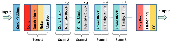 The fundamental modules of ResNet50 consist of two parts: the conv_block and the identity_block. The conv_block contains a convolutional block that utilizes a stride to reduce the dimensions of the feature map. Following this, the convolved features are aggregated with the residual connections and subjected to a ReLU activation, primarily used to adjust the size of channels and feature maps. The identity_block is designed to deepen the network and includes three convolutional layers with kernel sizes of 1 × 1, 3 × 3, and 1 × 1. After each convolutional layer, batch normalization and ReLU activation are sequentially applied. In the final convolutional layer, the input features are added to the convolved features before ReLU activation is performed. Based on these two modules and depending on the input parameters, convolutional layers and residual blocks of varying depths are stacked to produce feature maps of different scales. The overall architecture of ResNet50 is depicted in Figure 4.