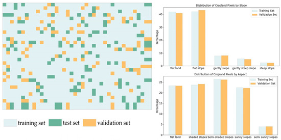For slope, the training set and validation set exhibited distinct distributions (Figure 7). In the training set, moderately sloping land accounted for 41.93%, and gently sloping land accounted for 42.05%. Flat land made up 7.89%, steeply sloping land accounted for 5.58%, and very steep land accounted for 2.54%. In the validation set, moderately sloping land accounted for 40.88% and gently sloping land accounted for 43.25%. The remaining portions were 8.15% flat land, 5.28% steeply sloping land, and 2.44% very steep land. This distribution ensures the network’s performance evaluation across various slope conditions.
