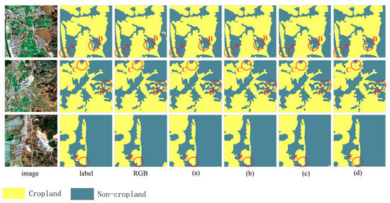 Figure 8 shows the classification effects on the feature combination images. Feature fusion can enhance the distinction between green vegetation, cropland, and other land types, providing richer land object information and reducing the sensitivity to lighting and weather conditions. From the cropland extraction effects using different feature fusion images, in the first group of images, for RGB, the images in (a) and (d) show instances in Area A where non-cropland was misidentified as cropland, leading to confused land object boundaries. In (a) and (d), Area B lost some detail information compared to the labels, with incomplete contours, while (b) shows better recognition effects in both Areas A and B. In the second group of images, for RGB, in (a), (b), and (d), there are instances in Areas C and D where cropland was misidentified as non-cropland, with a few debris patches appearing while the details recognized in (c) were more complete and closer to the shape of the actual land objects in the labels. In the third group of images, (b) shows better recognition effects. Overall, the land object boundaries extracted by the SE-ResUNet network were clear, with few debris patches and land object adhesions, resulting in good recognition effects. The feature combination images performed well in recognizing complex land object shapes. Compared to RGB images, the feature combination images had clearer details at the edges and fewer deformations in the extraction results.