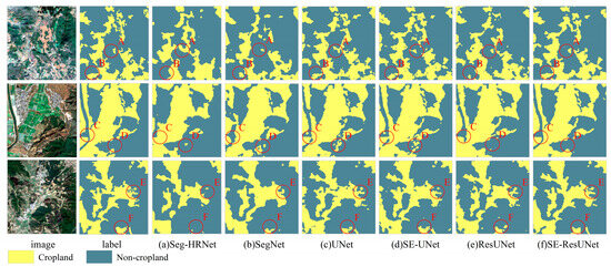 Comparison of cropland extraction results from SE-ResUNet and other network structures.