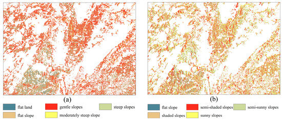 Cropland distribution extracted by SE-ResUNet: (a) slope-based distribution; (b) aspect-based distribution.